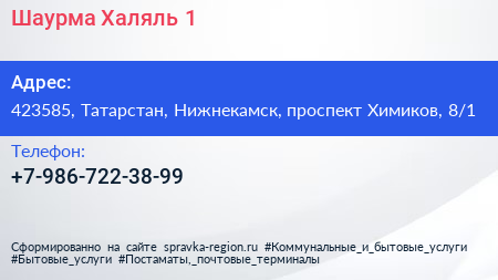 Шаурма Халяль №1 по адресу 423585, Татарстан, Нижнекамск, проспект Химиков, 8/1 в дальнейшем Организация, размещена в следующих категориях:
