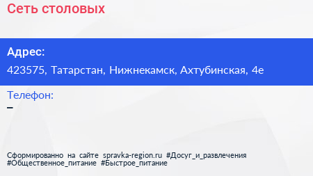 Сеть столовых по адресу 423575, Татарстан, Нижнекамск, Ахтубинская, 4е в дальнейшем Организация, размещена в следующих категориях: