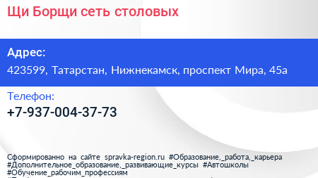 Щи-Борщи, сеть столовых по адресу 423599, Татарстан, Нижнекамск, проспект Мира, 45а в дальнейшем Организация, размещена в следующих категориях: