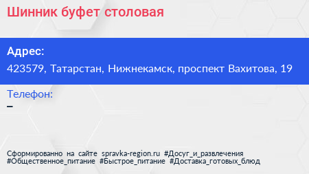 Шинник, буфет-столовая по адресу 423579, Татарстан, Нижнекамск, проспект Вахитова, 19 в дальнейшем Организация, размещена в следующих категориях: