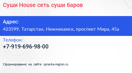 Суши House, сеть суши-баров по адресу 423599, Татарстан, Нижнекамск, проспект Мира, 45а в дальнейшем Организация, размещена в следующих категориях: