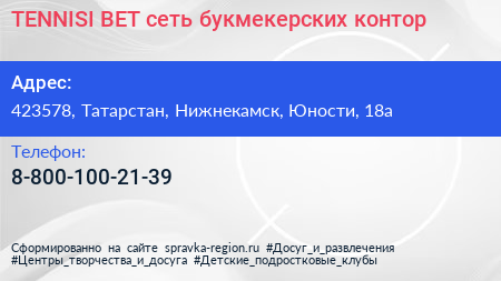TENNISI BET, сеть букмекерских контор по адресу 423578, Татарстан, Нижнекамск, Юности, 18а в дальнейшем Организация, размещена в следующих категориях: