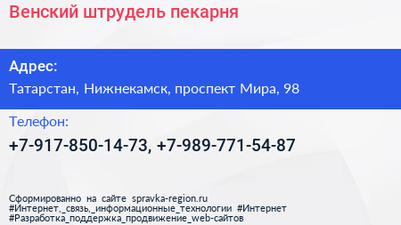 Венский штрудель, пекарня по адресу Татарстан, Нижнекамск, проспект Мира, 98 в дальнейшем Организация, размещена в следующих категориях: