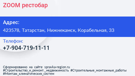 ZOOM, рестобар по адресу 423578, Татарстан, Нижнекамск, Корабельная, 33 в дальнейшем Организация, размещена в следующих категориях: