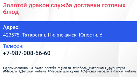 Золотой дракон, служба доставки готовых блюд по адресу 423575, Татарстан, Нижнекамск, Юности, 6 в дальнейшем Организация, размещена в следующих категориях:
