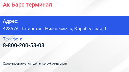Ак Барс, терминал по адресу 423576, Татарстан, Нижнекамск, Корабельная, 1 в дальнейшем Организация, размещена в следующих категориях: