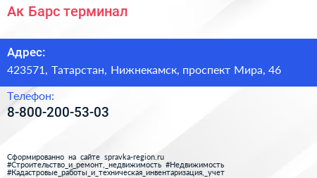 Ак Барс, терминал по адресу 423571, Татарстан, Нижнекамск, проспект Мира, 46 в дальнейшем Организация, размещена в следующих категориях: