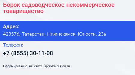 Борок, садоводческое некоммерческое товарищество по адресу 423576, Татарстан, Нижнекамск, Юности, 23а в дальнейшем Организация, размещена в следующих категориях: