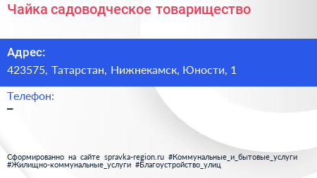 Чайка, садоводческое товарищество по адресу 423575, Татарстан, Нижнекамск, Юности, 1 в дальнейшем Организация, размещена в следующих категориях: