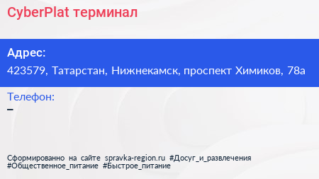 CyberPlat, терминал по адресу 423579, Татарстан, Нижнекамск, проспект Химиков, 78а в дальнейшем Организация, размещена в следующих категориях: