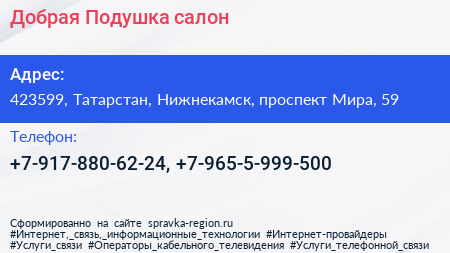 Добрая Подушка, салон по адресу 423599, Татарстан, Нижнекамск, проспект Мира, 59 в дальнейшем Организация, размещена в следующих категориях: