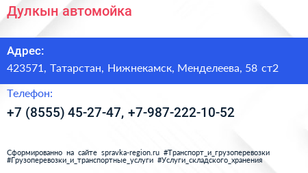 Дулкын, автомойка по адресу 423571, Татарстан, Нижнекамск, Менделеева, 58 ст2 в дальнейшем Организация, размещена в следующих категориях: