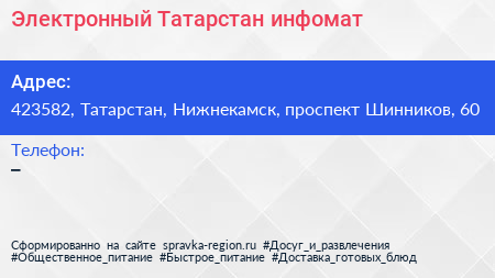 Электронный Татарстан, инфомат по адресу 423582, Татарстан, Нижнекамск, проспект Шинников, 60 в дальнейшем Организация, размещена в следующих категориях: