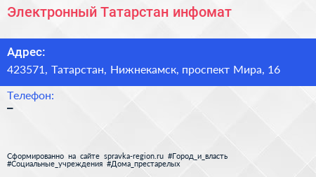 Электронный Татарстан, инфомат по адресу 423571, Татарстан, Нижнекамск, проспект Мира, 16 в дальнейшем Организация, размещена в следующих категориях: