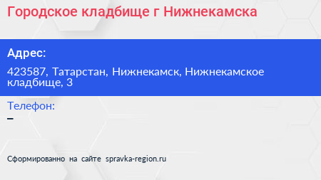 Городское кладбище г. Нижнекамска по адресу 423587, Татарстан, Нижнекамск, Нижнекамское кладбище, 3 в дальнейшем Организация, размещена в следующих категориях: