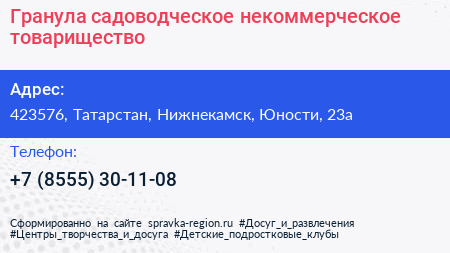 Гранула, садоводческое некоммерческое товарищество по адресу 423576, Татарстан, Нижнекамск, Юности, 23а в дальнейшем Организация, размещена в следующих категориях: