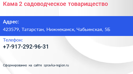 Кама-2, садоводческое товарищество по адресу 423579, Татарстан, Нижнекамск, Чабьинская, 5Б в дальнейшем Организация, размещена в следующих категориях: