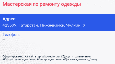 Мастерская по ремонту одежды по адресу 423599, Татарстан, Нижнекамск, Чулман, 9 в дальнейшем Организация, размещена в следующих категориях:
