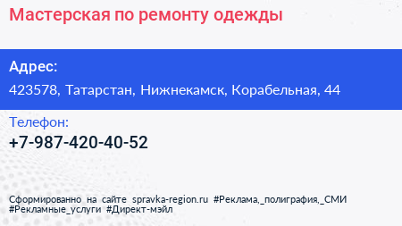 Мастерская по ремонту одежды по адресу 423578, Татарстан, Нижнекамск, Корабельная, 44 в дальнейшем Организация, размещена в следующих категориях:
