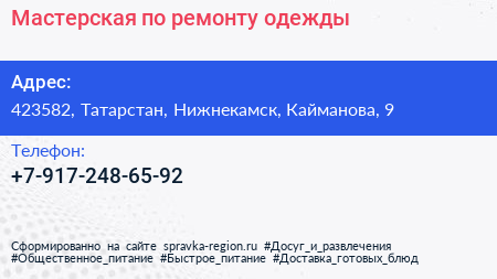Мастерская по ремонту одежды по адресу 423582, Татарстан, Нижнекамск, Кайманова, 9 в дальнейшем Организация, размещена в следующих категориях: