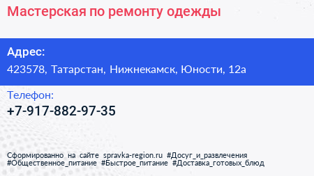 Мастерская по ремонту одежды по адресу 423578, Татарстан, Нижнекамск, Юности, 12а в дальнейшем Организация, размещена в следующих категориях: