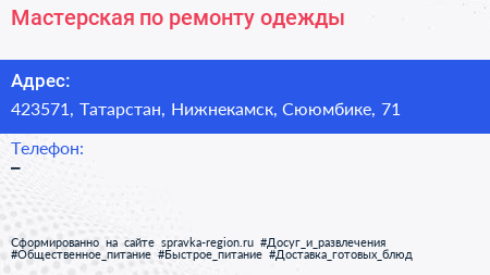 Мастерская по ремонту одежды по адресу 423571, Татарстан, Нижнекамск, Сююмбике, 71 в дальнейшем Организация, размещена в следующих категориях: