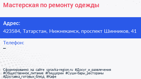 Мастерская по ремонту одежды по адресу 423584, Татарстан, Нижнекамск, проспект Шинников, 41 в дальнейшем Организация, размещена в следующих категориях: