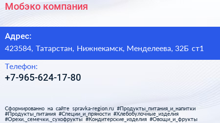 Мобэко, компания по адресу 423584, Татарстан, Нижнекамск, Менделеева, 32Б ст1 в дальнейшем Организация, размещена в следующих категориях: