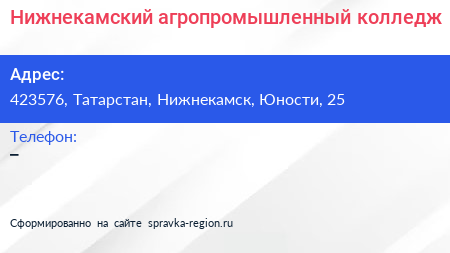 Нижнекамский агропромышленный колледж по адресу 423576, Татарстан, Нижнекамск, Юности, 25 в дальнейшем Организация, размещена в следующих категориях: