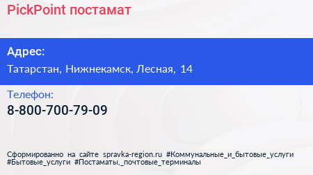 PickPoint, постамат по адресу Татарстан, Нижнекамск, Лесная, 14 в дальнейшем Организация, размещена в следующих категориях: