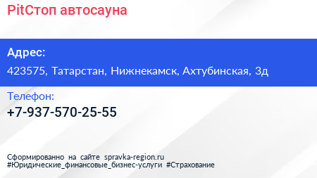 PitСтоп, автосауна по адресу 423575, Татарстан, Нижнекамск, Ахтубинская, 3д в дальнейшем Организация, размещена в следующих категориях: