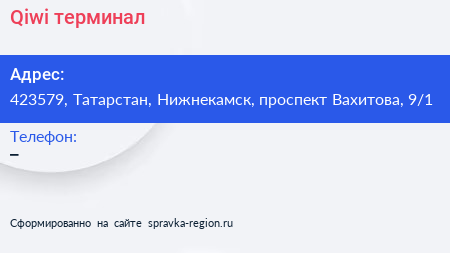 Qiwi, терминал по адресу 423579, Татарстан, Нижнекамск, проспект Вахитова, 9/1 в дальнейшем Организация, размещена в следующих категориях: