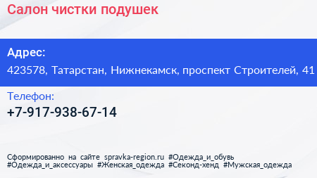 Салон чистки подушек по адресу 423578, Татарстан, Нижнекамск, проспект Строителей, 41 в дальнейшем Организация, размещена в следующих категориях: