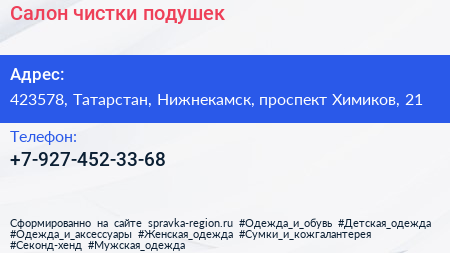 Салон чистки подушек по адресу 423578, Татарстан, Нижнекамск, проспект Химиков, 21 в дальнейшем Организация, размещена в следующих категориях: