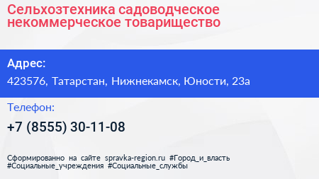 Сельхозтехника, садоводческое некоммерческое товарищество по адресу 423576, Татарстан, Нижнекамск, Юности, 23а в дальнейшем Организация, размещена в следующих категориях: