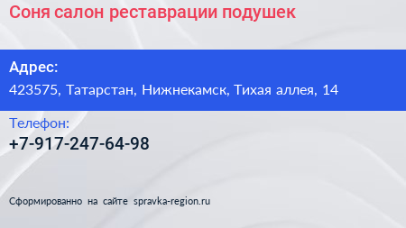 Соня, салон реставрации подушек по адресу 423575, Татарстан, Нижнекамск, Тихая аллея, 14 в дальнейшем Организация, размещена в следующих категориях: