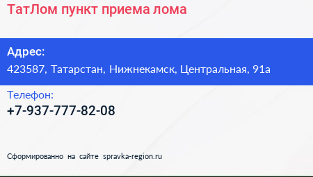 ТатЛом, пункт приема лома по адресу 423587, Татарстан, Нижнекамск, Центральная, 91а в дальнейшем Организация, размещена в следующих категориях: