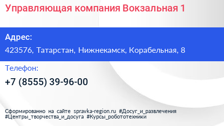 Управляющая компания Вокзальная-1 по адресу 423576, Татарстан, Нижнекамск, Корабельная, 8 в дальнейшем Организация, размещена в следующих категориях: