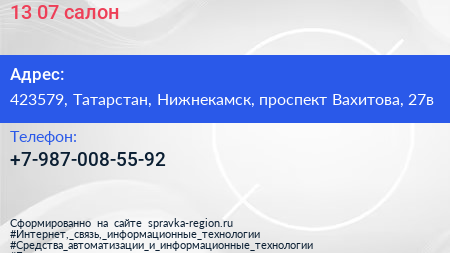 13/07, салон по адресу 423579, Татарстан, Нижнекамск, проспект Вахитова, 27в в дальнейшем Организация, размещена в следующих категориях: