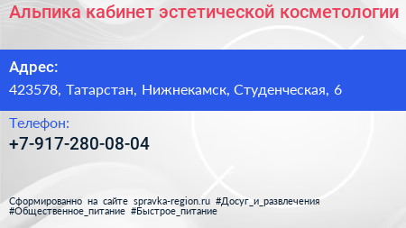 Альпика, кабинет эстетической косметологии по адресу 423578, Татарстан, Нижнекамск, Студенческая, 6 в дальнейшем Организация, размещена в следующих категориях: