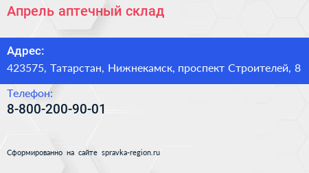 Апрель, аптечный склад по адресу 423575, Татарстан, Нижнекамск, проспект Строителей, 8 в дальнейшем Организация, размещена в следующих категориях: