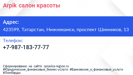 Arpik, салон красоты по адресу 423599, Татарстан, Нижнекамск, проспект Шинников, 13 в дальнейшем Организация, размещена в следующих категориях: