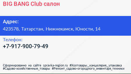 BIG BANG Club, салон по адресу 423578, Татарстан, Нижнекамск, Юности, 14 в дальнейшем Организация, размещена в следующих категориях: