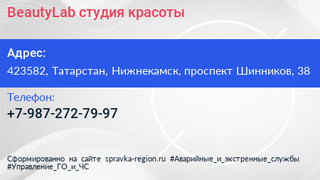 BeautyLab, студия красоты по адресу 423582, Татарстан, Нижнекамск, проспект Шинников, 38 в дальнейшем Организация, размещена в следующих категориях: