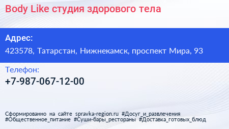 Body-Like, студия здорового тела по адресу 423578, Татарстан, Нижнекамск, проспект Мира, 93 в дальнейшем Организация, размещена в следующих категориях: