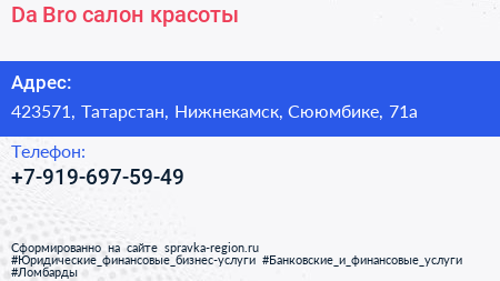 Da & Bro, салон красоты по адресу 423571, Татарстан, Нижнекамск, Сююмбике, 71а в дальнейшем Организация, размещена в следующих категориях: