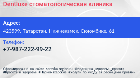 Dentluxe, стоматологическая клиника по адресу 423599, Татарстан, Нижнекамск, Сююмбике, 61 в дальнейшем Организация, размещена в следующих категориях: