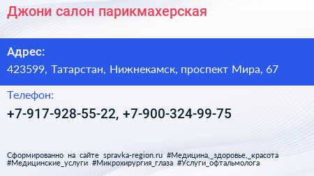 Джони, салон-парикмахерская по адресу 423599, Татарстан, Нижнекамск, проспект Мира, 67 в дальнейшем Организация, размещена в следующих категориях: