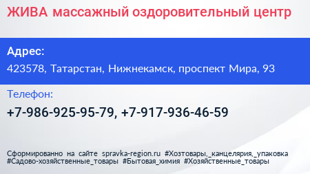 ЖИВА, массажный оздоровительный центр по адресу 423578, Татарстан, Нижнекамск, проспект Мира, 93 в дальнейшем Организация, размещена в следующих категориях:
