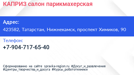 КАПРИЗ, салон-парикмахерская по адресу 423582, Татарстан, Нижнекамск, проспект Химиков, 90 в дальнейшем Организация, размещена в следующих категориях: